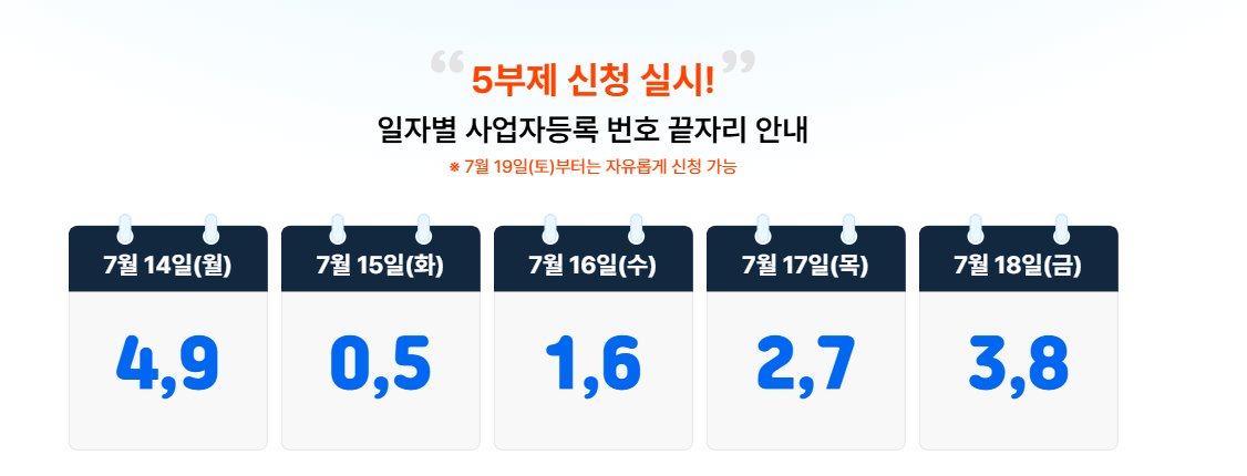 [단, 7월 14일부터 18일까지는 사업자등록번호 끝자리 기준 5부제로 신청, 7월 19일(토)부터는 요일 제한 없이 자유롭게 신청 가능.] - 소상공인진흥공단이 국세청 DB 기반으로 자격 심사 (알림톡을 통해, 지원대상 선정 안내)